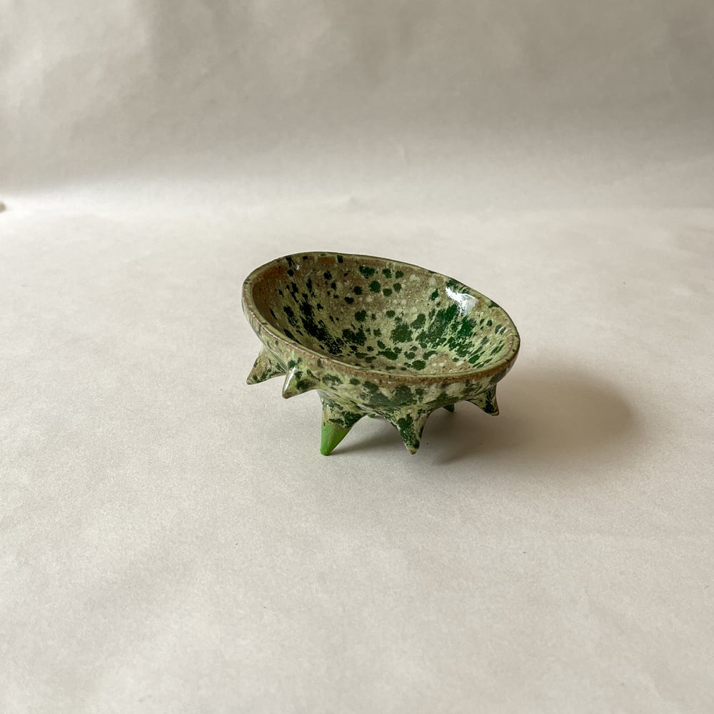 Spikey trinket dish in lime green glaze with dark green speckles