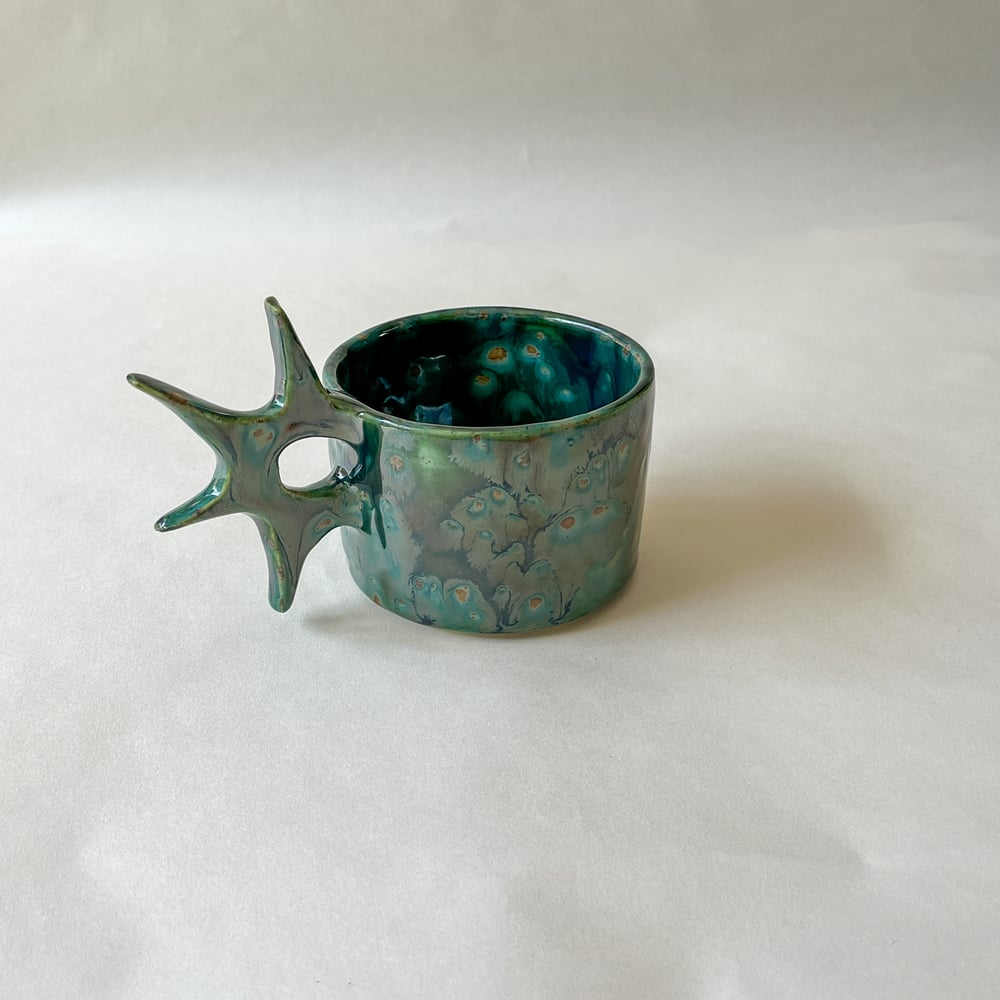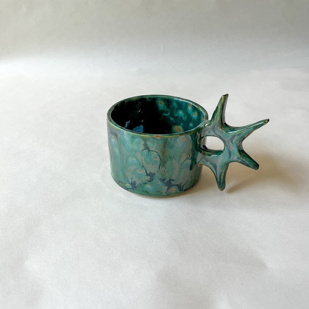 Spikey handle mug with emerald glaze with speckles of lighter greens & browns